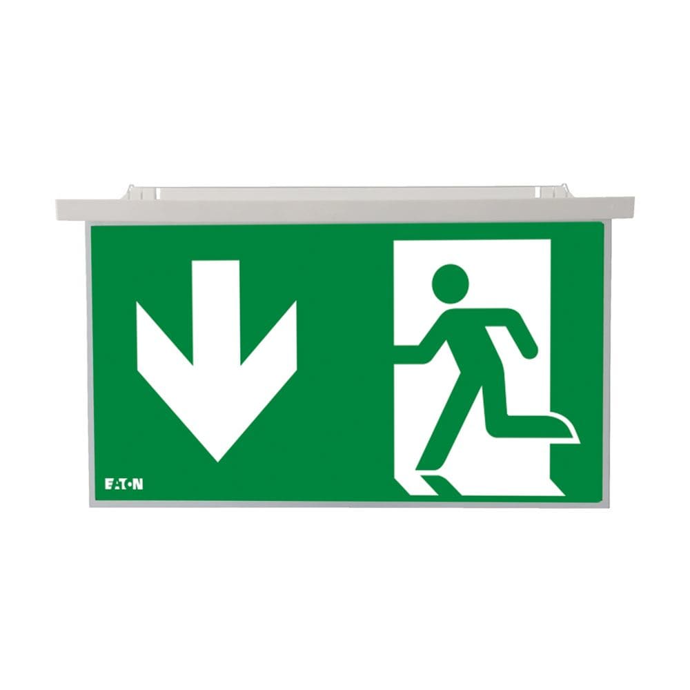 Pannello di segnalazione bifacciale ad alta uniformità Eaton da abbinare ad apparecchi NexiTech, modello NEXI-PLEX-DD, per indicazione basso-basso, distanza di visibilità 30m, compatibile con le versioni IP40.