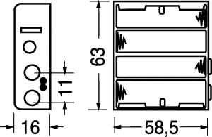 PORTAPILE PER 4 PILE STILO (AA-UM3). CORPO:polipropilene. CONNESSIONE:a bottone. MEDIANTE:4/11012 - 4/11013. PER BATTER.NI-CD:30/212. PER BATTER.NI-MH:30/208. PILE ALCALINE:30/24050 - 30/25050.