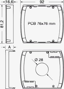 CONTENITORI AREATI A PARETE. Contenitore da parete e/o da tavolo per il controllo ambiente e telecontrollo. Chiusura a scatto fra base e coperchio. Può ospitare una scheda nel coperchio con fissaggio a scatto o a vite e una nella base con fissaggio a vite. Presenta sul frontale una sede ribassata per applicazione di eventuale etichetta adesiva. Alette di areazione con effetto a camino nei due lati. MATERIALE:abs Classe UL94V0. Dim. A: 16 mm.