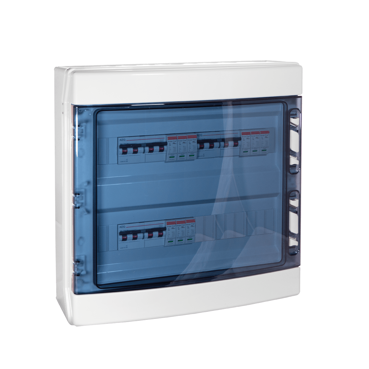 Quadro cablato di protezione stringa per impianto fotovoltaico. 3 stringhe singole fino a 880Vdc protezione con 3 interruttori automatici con bobina a lancio di corrente 110...415Vac/110...125Vdc in ingresso, 3 scaricatori di sovratensione tipo 2 a 3 cartucce 1000Vdc Isn 20kA e contenitore in ABS con porta trasparente 36 moduli IP65. Interruttore: AEG E94SUCB16 curva B 16A (x3)