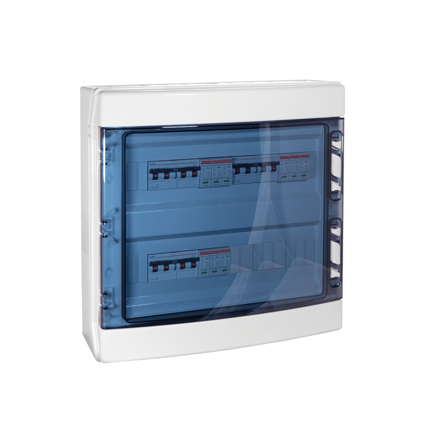 Quadro cablato di protezione stringa per impianto fotovoltaico. 4 stringhe singole fino a 880Vdc con protezione tramite 4 interruttori automatici in ingresso, 4 scaricatori di sovratensione tipo 2 a 3 cartucce 1000Vdc Isn 20kA, 4 basi portafusibili e contenitore in ABS con porta trasparente 36 moduli IP65. Interruttore: AEG E94SUCB16 curva B 16A