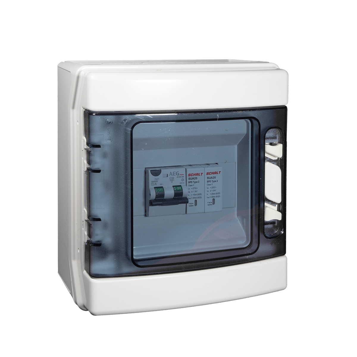 Quadro cablato AC monofase per installazione tra inverter e quadro di alimentazione. Composto da un interruttore magnetotermico differenziale in curva C da 6kA classe A da 300mA e da uno scaricatore di sovratensione di Tipo 2. La componentistica è inserita all'interno di un centralino in materiale isolante IP65 a 8 moduli.