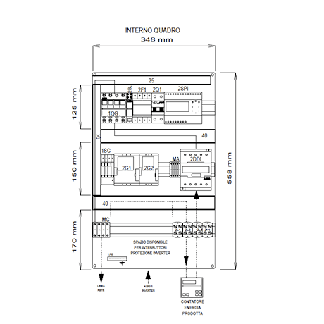 I quadri di interfaccia OPEN rappresentano una soluzione per la connessione di impianti fotovoltaici CEI 0-21. I quadri OPEN nascono con lo spazio e la predisposizione di cablaggio per gli interruttori di protezione inverter che saranno installabili successivamente tramite i collegamenti già forniti a corredo. - Interruttore Generale 4x40A 15kA (EN60947-2) con bobina di sgancio per funzione di rincalzo - Relè di interfaccia NA003 con TEST, con Ups di emergenza come da norma CEI 0-21 - Contattore DDI 4 poli 22kW AC-3. Spazio per cablaggio Interruttori protezione inverter: 1x20kW 3F+N, 2x10kW 3F+N, 3x6kW F+N - Kit di cablaggio incluso nella confezione (3x16mm2 nero+1x16mm2 blu; 6x10mm2 nero+2x10mm2 blu) - Interruttori previsti (da ordinare a parte): 6KW F+N HD90C32/300;10kW 3F+N DMA63NPC20/300;12,5kW 3F+N DMA63NPC25/300; 15kW 3F+N DMA63NPC32/300;20kW 3F+N E94SC40+HD9532/300. Tutti i componenti sono racchiusi all'interno di un contenitore a parete in ABS IP54 LxHxP 600x400x200mm.