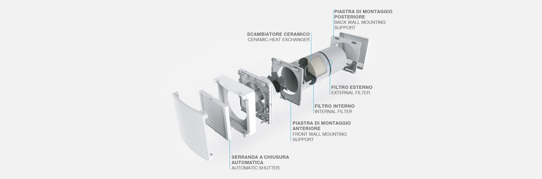 Tempero Eco Ceram è studiato per essere utilizzato nei locali nobili della casa (es: soggiorno, sala da pranzo, camera da letto). La versione Eco Ceram Base può essere installata singolarmente, anche se la massima efficienza del prodotto si ottiene conun’installazione di coppia. Le versioni Eco Ceram Active e Eco Ceram Wireless infatti, grazie alla loro tecnologia di sincronizzazione, permettono di installare due o più prodotti che comunicano tra loro. La versione Base è dotata di: Serranda automatica di chiusura interna ed invisibile. Interruttore ON/OFF e interruttore due velocità (remotabili). Segnalatore visivo per le funzioni.