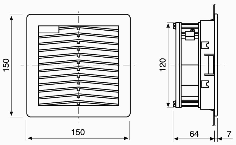 Gruppo filtro "FPF" con flusso d'aria dall'esterno verso l'interno dell'involucro. Grazie al particolare design risponde alle esigenze di compattezza e rapidità di installazione tipiche delle moderne apparecchiature. Caratterizzato da un basso profilo esterno, da un sistema di montaggio a scatto con ganci elastici e da una guarnizione di tenuta premontata che consente di ottenere una protezione alla polvere e all'acqua. Montaggio senza viti in aperture di forma quadrata come da schema di foratura; spessore della lamiera compreso tra 1,5 e 2,2 mm; eventuale fissaggio attraverso viti a testa svasata non fornite. Parti plastiche in PC/ABS, guarnizione di tenuta in schiuma poliuretanica posizionata a macchina. Panno filtro in fibre sintetiche termolegate a struttura progressiva, classe di filtrazione G3 secondo EN 779. Ventilatori su cuscinetti a sfera schermati e autolubrificati.