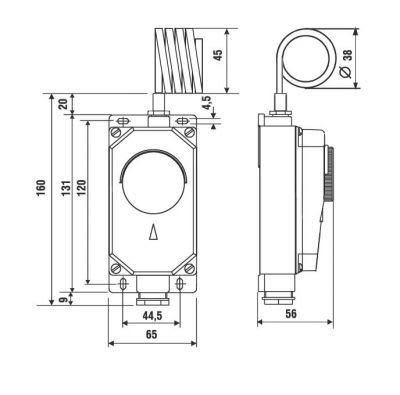 Termostati per la regolazione della temperatura ambiente in capannoni industriali, celle frigorifere, impianti di stagionatura, serre, quadri elettrici industriali. •Microinterruttore in commutazione a scatto rapido con contatti in AgCdO dorati. •Tensione nominale d'isolamento Ui 380V~•Corrente nominale di servizio continuativo Ith 15A •Rispondenza alle norme CEI EN 60947-5-1. • Elemento sensibile con membrana in acciaio inossidabile. •Capillare a spirale in rame stagnato.•Basetta, coperchio e manopola in materiale termoplastico antiur to e autoestinguente V0. •Uscita dei collegamenti elettrici con passacavo in PVC.•Temperatura di immagazzinaggio e trasporto -35 ÷ 120°C. •Peso unitario 0,16 Kg.