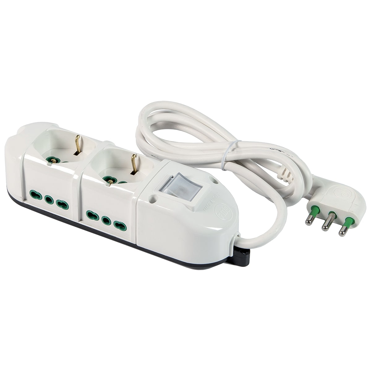 Multipresa TRIAX 2 prese bipasso italo/tedesche 2P+T 16A in testa 4 prese bipasso italiane 2P+T 16A laterali cavo 1,5 m. 3G1 H05VV-F spina a squadra italiana 2P+T 16A + interruttore bipolare luminoso, colore bianco