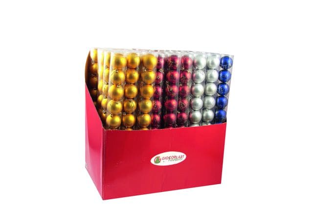 TUBO 10 SFERE, 2 DECORI, in palbox assortite: 18 oro, 18 rosso, 12 argento, 6 blu - ? 60 mm. imb.: 5