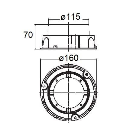 Passum Up Ø 125 Ultraflat - Cassaforma. Cassaforma in tecnopolimero a perdere. Dimensione: D2: Ø160 mm. D1: Ø115 mm. H: 70 mm. Incasso a terra o parete basso spessore.
