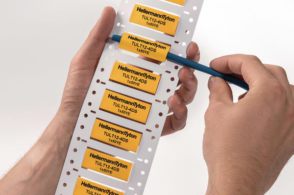 Rapporto di restringimento 3:1. Pretranciati a 50mm, 25mm e 16mm come standard. Disponibili in colore bianco e giallo. Buona resistenza meccanica e ai solventi organici e chimici. Elevata flessibilità. Forniti in comodi contenitori. Il TULT DS è un materiale termorestringente 3:1 certificato UL, pretranciato e disposto in un comodo formato Ladder Style. Questo formato permette non solo la stampa su entrambi i lati, ma anche la possibilità di prelevare il marcacavo desiderato con facilità. Il composto di poliolefina del TULT ha buone caratteristiche meccaniche e di resistenza ai solventi organici e chimici. La superficie della guaina viene preparata in modo da garantire una elevata qualità di stampa in ogni momento utilizzando le stampanti a trasferimentotermico di HellermannTyton.