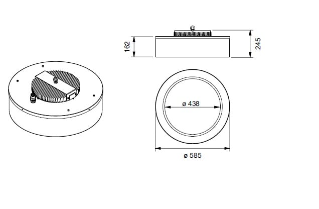 Corpo in lamiera d’alluminio tornito in lastra, verniciata con polveri epossidiche con alta resistenza alla corrosione con pretrattamento di fosfocromatazione. Vetro temperato trasparente antishock termico. A richiesta sabbiato o microprismato. Guarnizione in silicone. Dissipatore: alluminio anodizzato. Presa femmina per alimentazione da cablare (7PR3702-V) inclusa. Alimentazione incorporata: CAE elettronica. Riflettore in alluminio tornito 99.85%, ossidato e brillantato anodicamente per un elevato rendimento luminoso. Sorgente luminosa LED. Emissione diretta. Sistema di fissaggio a sospensione con gancio in acciaio zincato. Non idonea per applicazioni all’esterno. A richiesta: Gruppo di emergenza autoalimentato 1h/3h, dove le dimensioni lo consentono. Temperatura di colore del LED K diversa da quella specificata. CRI > 80. Colore grafite. Lampada LED 64W 9500lm 4000K.