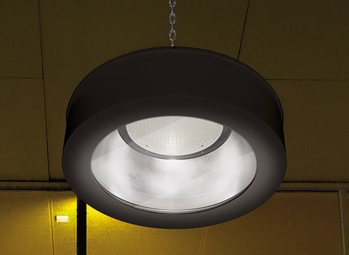 Corpo in lamiera d’alluminio tornito in lastra, verniciata con polveri epossidiche con alta resistenza alla corrosione con pretrattamento di fosfocromatazione. Vetro temperato trasparente antishock termico. A richiesta sabbiato o microprismato. Guarnizione in silicone. Dissipatore: alluminio anodizzato. Presa femmina per alimentazione da cablare (7PR3702-V) inclusa. Alimentazione incorporata: CAE elettronica, dimmerabile DALI. Riflettore in alluminio tornito 99.85%, ossidato e brillantato anodicamente per un elevato rendimento luminoso. Sorgente luminosa LED. Emissione diretta. Sistema di fissaggio a sospensione con gancio in acciaio zincato. Non idonea per applicazioni all’esterno. A richiesta: Gruppo di emergenza autoalimentato 1h/3h, dove le dimensioni lo consentono. Temperatura di colore del LED K diversa da quella specificata. CRI > 90. Colore grafite. Lampada LED 85W 13800lm 4000K.