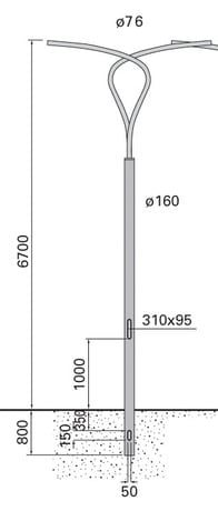 Palo di geometria cilindrica, realizzato in acciaio zincato a caldo 70 micron come da normativa UNI EN ISO 1461 (EN 40-5), sottoposto a trattamento di verniciatura a polvere texturizzata RAL 9005. Il ciclo standard di verniciatura è riferito alla norma UNI EN ISO 12944 con classe di durabilità C4-H (idoneo per aree industriali e zone costiere con moderata salinità. Per preservare l'integrità del manufatto la medesima norma UNI EN ISO 12944-1 prevede una manutenzione ordinaria e un controllo con periodicità di 6 mesi. Il palo è costituito da un unico tubo metallico; è in acciaio EN10025-S235JR, ha diametro 160 mm, spessore 3 mm e altezza 6700 mm f.t. L'asola per la portella è dimensiona a 310x95 mm, ad altezza 1000 mm dal terreno, idonea per il montaggio della morsettiera a due fusibili (cod. 1863). Il palo permette l'installazione di morsettiere italiane (grado di protezione IP44 IK08), francesi, spagnole (solo piccole), inglesi (con adattatore in legno marino cod. B944 da ordinare separatamente) e tedesche/svizzere (tramite guida DIN cod. B943 da ordinare separatamente).Portella a filo, realizzata in fusione di alluminio, con relativa chiave per la portella (cod. 0246); la chiusura è assicurata tramite una guarnizione di tenuta che si adatta alle irregolarità superficiali del palo. Il palo è completo di braccio doppio di lunghezza 1400 mm (per ciascun braccio). Bracci realizzati in acciaio S235JR ø76mmm spessore 4mm. Nella parte superiore del palo è saldata una piastra metallica realizzata in acciaio zincato, munita di 4 fori filettati, adibita al fissaggio dei bracci per mezzo di viti M10 UNI 5931 in acciaio inox AISI 304.