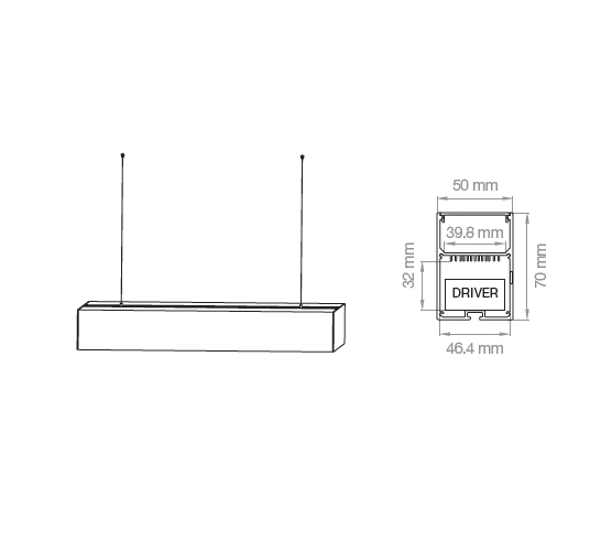 KIT PROFILO SOSPENSIONE - Profilo alluminio sospensione L. 2 mt per strisce led completo di accessori, confezionato singolarmente con nr. 1 diffusore opaco in policarbonato, nr. 2 tappi chiusi, tutto incluso nella confezione. Potenza MAX consigliata 55w/ml. Finitura: Alluminio.