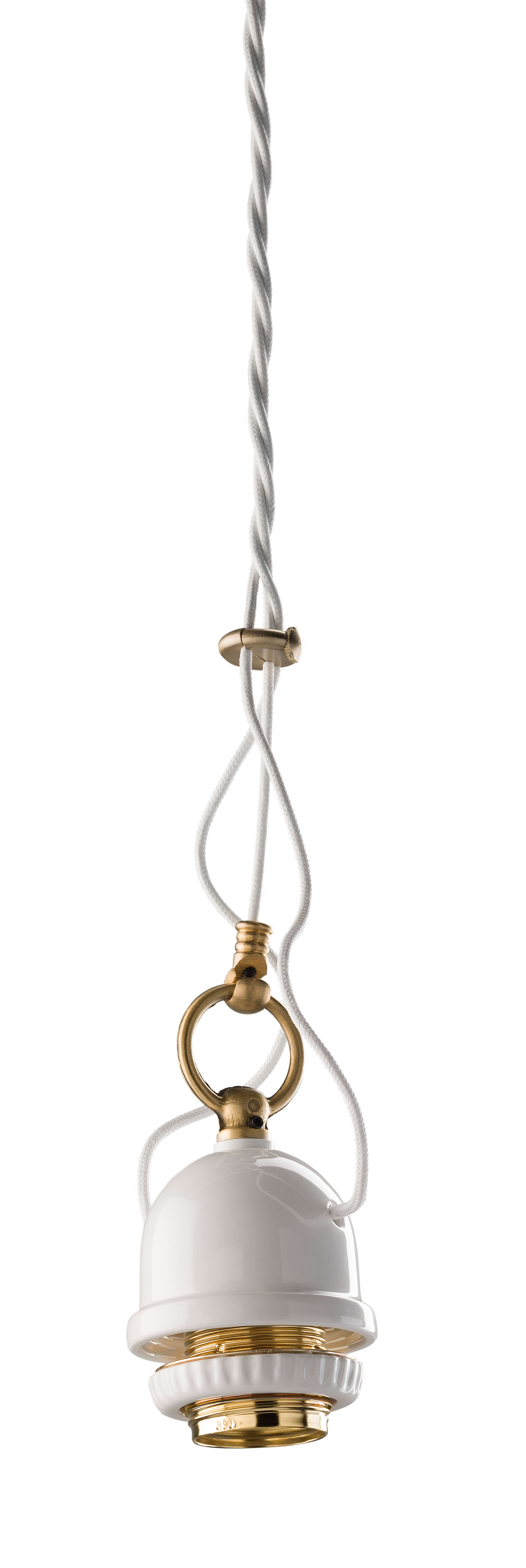 SERIE CLASSIC - SOSPENSIONI Sospensione - senza rosone - Attacco E27 - Potenza 60W - Grado di protezione IP 20. In porcellana bianca con ghiera in porcellana bianca. Cavo tessile trecciato bianco.