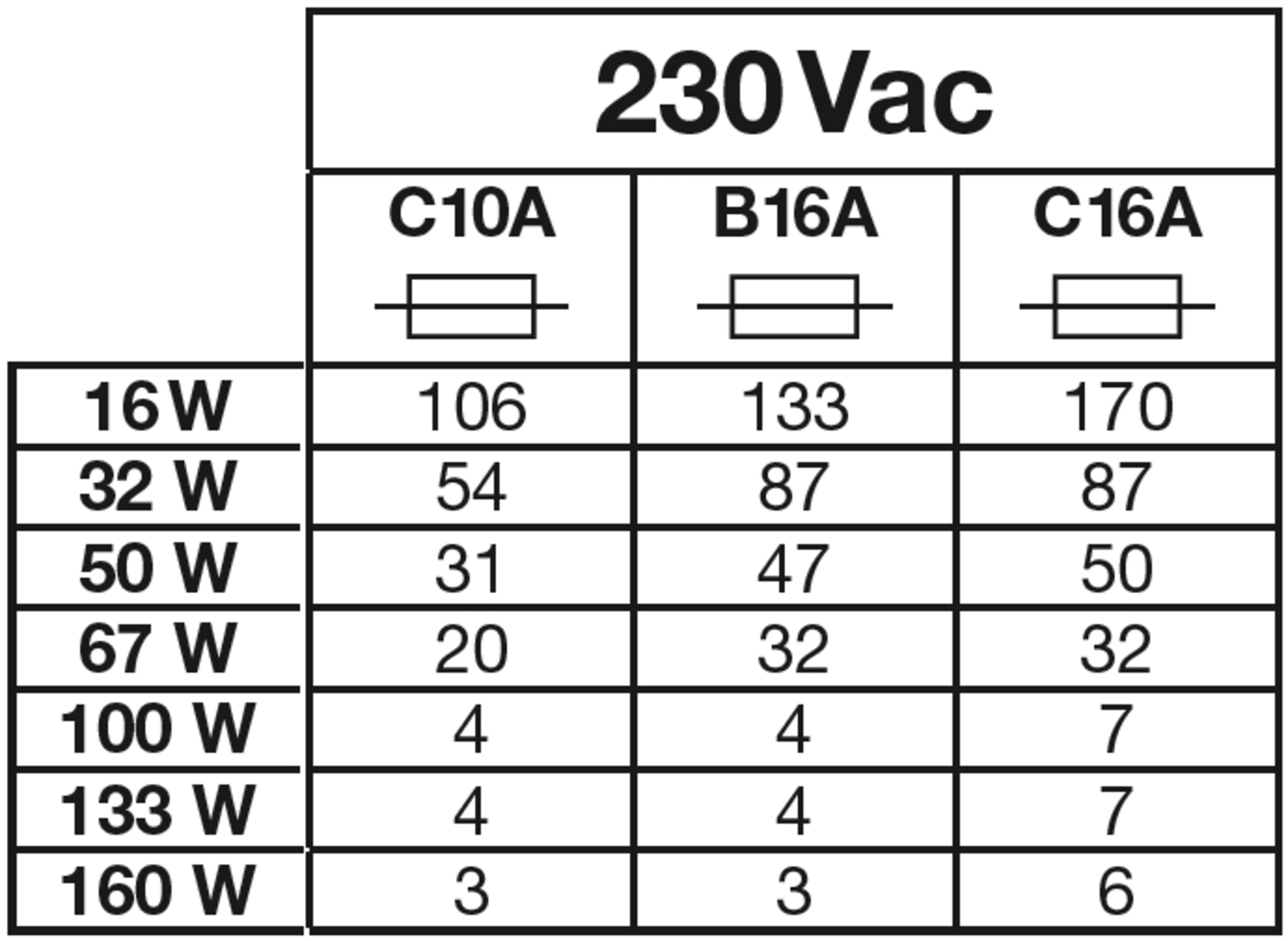 Max. Anzahl der Leuchten pro Leitungsschutzschalter C16: