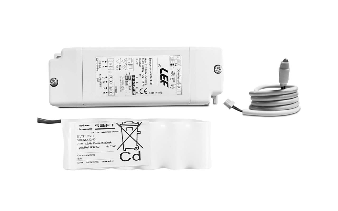 Kit emergenza per LED 60-200V 88-25mA autonomia 1 ora con batterie a pacchetto 7,2V - 1,6Ah IP20