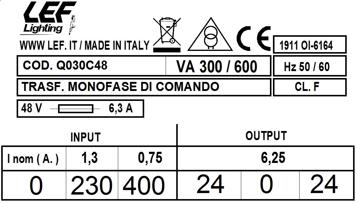 LEF LIGHTING SRL - LEFQ030C48 T.M. 300VA 230.400V / 24.0.24V - Q030C48