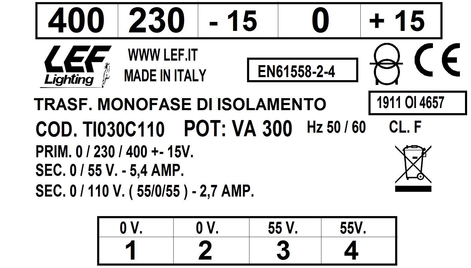 LEF LIGHTING SRL - LEFTI030C110 T.M. 300VA 230.400V / 55 110V - TI030C110