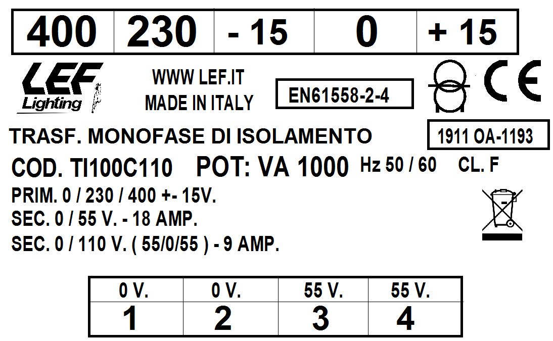 LEF LIGHTING SRL - LEFTI100C110 T.M. 1000VA 230.400V / 55 110V - TI100C110