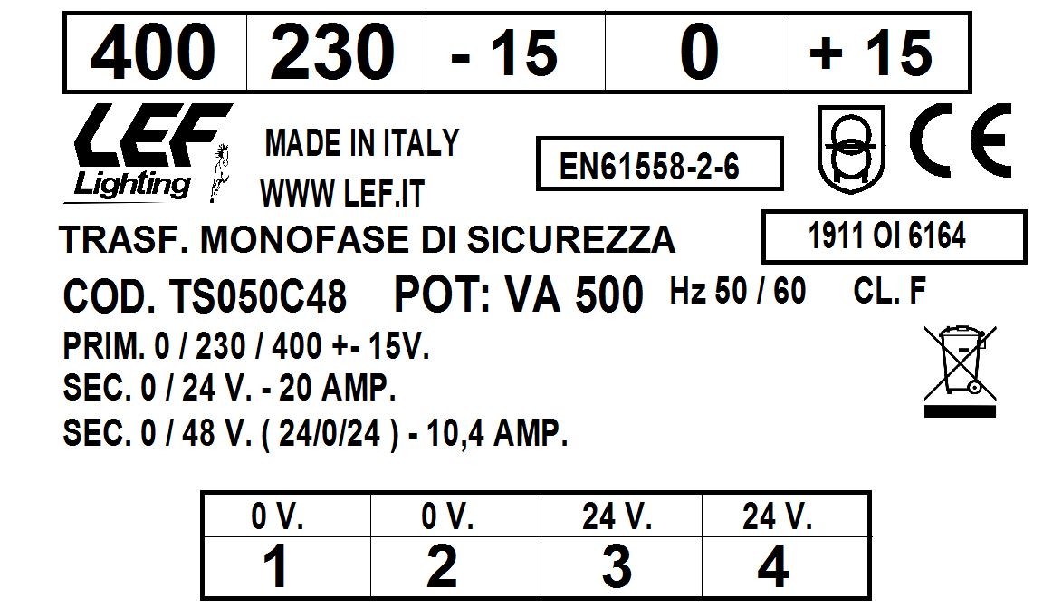 LEF LIGHTING SRL - LEFTS050C48 T.M. 500VA 230.400V / 24 48V - TS050C48