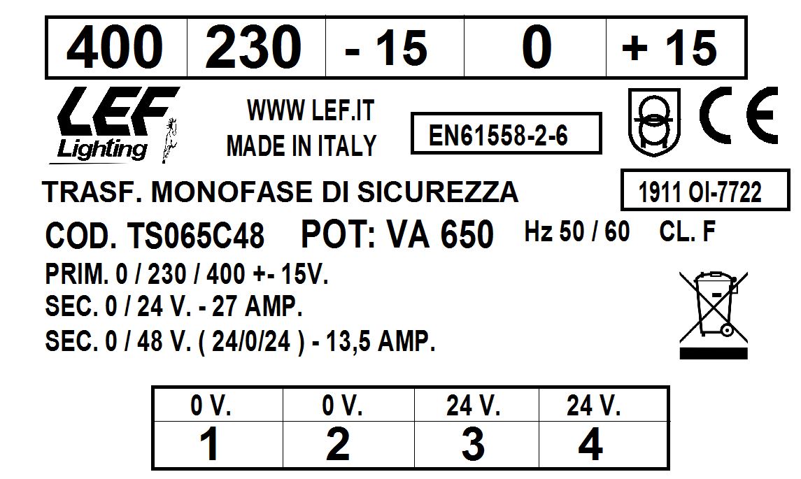 LEF LIGHTING SRL - LEFTS065C48 T.M. 650VA 230.400V / 24 48V - TS065C48