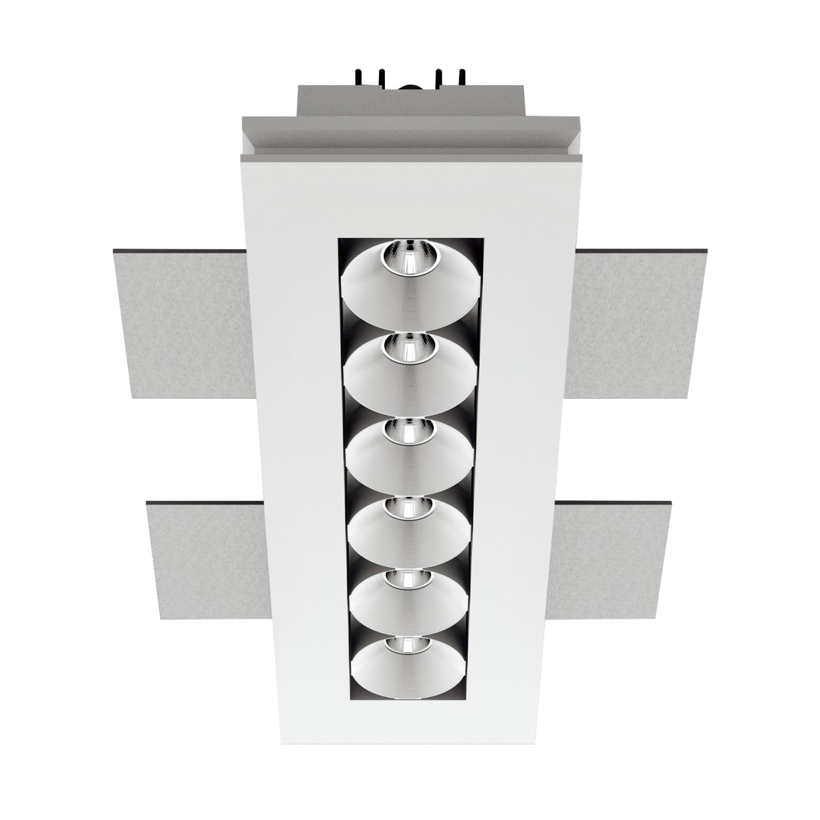 Downlights a singola emissione per applicazione indoor. La sorgente luminosa LED, di colore bianco caldo, con distribuzione luminosa Flood, è composta da 6 LED powerled, con una CCT 3000 K ed un CRI 90; il flusso luminoso della sorgente è di 1398 lm, con un'efficienza nominale di 116.5 lm/W.
