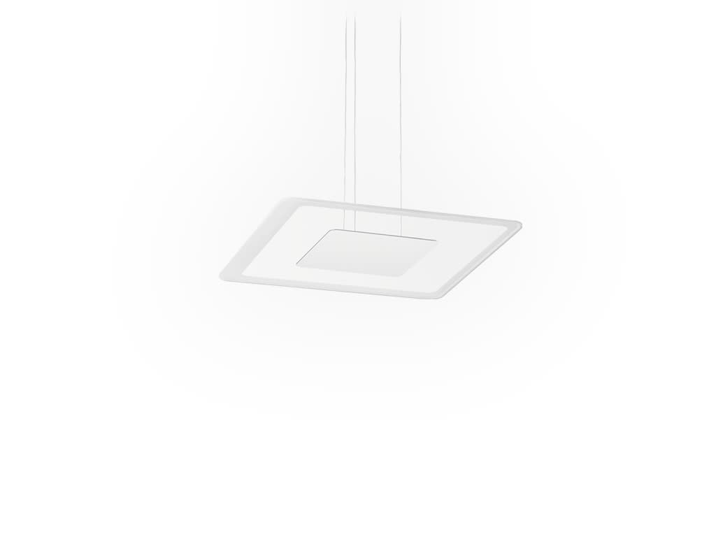 Sospensione a doppia emissione per applicazione indoor. La sorgente luminosa LED, di colore bianco caldo, con distribuzione luminosa General Lighting, è composta da 56 LED stripled, con una CCT 3000 K ed un CRI 80; il flusso luminoso della sorgente è di4457 lm, con un'efficienza nominale di 111.4 lm/W. Il corpo dell'apparecchio, realizzato in ferro, presenta una finitura di colore cromo, ottenuta tramite verniciatura a polvere; il diffusore è prodotto in vetro, con una lavorazione di sabbiatura; la montatura è prodotta in ferro, con una finitura di colore bianco ral 9003 goffrato, ottenuta tramite verniciatura a polvere. Il grado di protezione è IP20; La potenza assorbita dall'apparecchio è di 40 W.