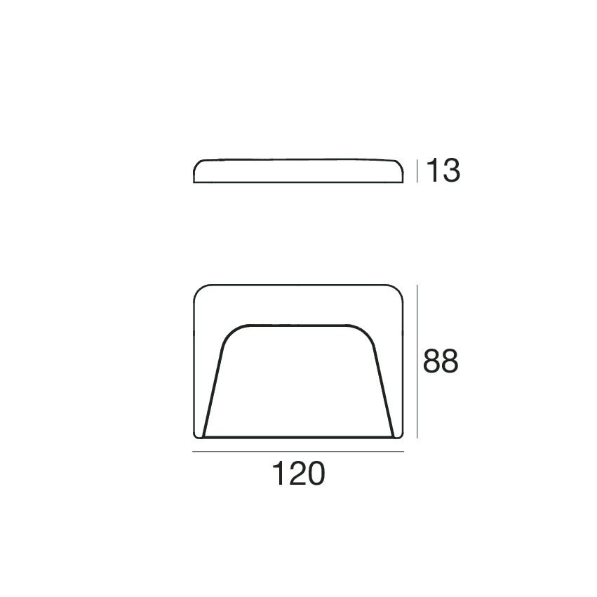 Lampada a parete a singola emissione per applicazione outdoor. La sorgente luminosa LED, di colore bianco caldo, con distribuzione luminosa Asymmetric Wallwasher, è composta da 12 LED topled, con una CCT 3000 K ed un CRI 80; il flusso luminoso della sorgente è di 136 lm, con un'efficienza nominale di 136.0 lm/W.
