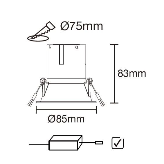 Faretto da incasso, Diametro 85*83mm, foro 75mm, non orientabile, Triac-dim, 7/12W, 3CCT 2700K/3000K/4000K, 700/1200lm, 100lm/w, 220-240V, IP44 anteriore/IP20 posteriore, IK02, BA38, UGR<19, -20~40℃, 50 000H (50 000hL70B50 per LED, 50 000h per driver), 5anni di garanzia, driver esterno, classe II, bianco (RAL9016, opaco), corpo in alluminio pressofuso + finiture in alluminio pressofuso + lente in PC, PF 0,9, 50/60Hz, cavo di uscita da 0,3M senza spina, con scatola di collegamento rapido, montaggio a incasso. Certificati:CE,RoHS,REACH,ERP