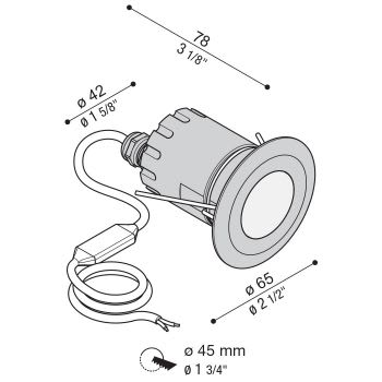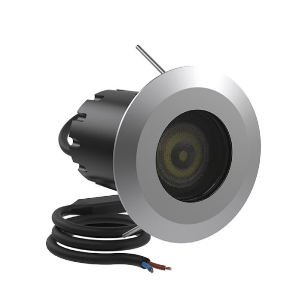 Adatto per installazioni a parete e soffitto, anche per uso esterno. Idoneo per incassi da terra ad uso calpestabile, fissaggio mediante armatura da incasso fornita a parte. Prodotto finalizzato all’impiego di sorgenti luminose a LED per luce di accento e segnalazione. Ghiere in acciaio AISI316L. Corpo in alluminio anodizzato nero. Diffusore in vetro temprato. Guarnizioni in silicone. 1.5 m di cavo di alimentazione H05RN-F pre-cablato e bloccato tramite pressacavo in Ottone Nichelato. Dimmerazione disponibile. Bulloneria in acciaio inox AISI 316L. Tutti i cavi sono provvisti di una speciale guaina che protegge il faretto dalle infiltrazioni di acqua e umidità. La molla di ritenuta si adatta sia per applicazioni che prevedono l'utilizzo di armatura da incasso che direttamente in controsoffittature in cartongesso. Versione in tensione costante 12/24V. Versione in corrente costante 350 mA/500 mA: utilizzare esclusivamente alimentatori di tipo SELV o equivalenti. Tutti i cavi vengono forniti integrati di un sistema elettronico che consente il collegamento non polarizzato del faretto. INC 35 : Il dispositivo elettronico inoltre, impedisce l'interruzione di linee di faretti collegati in serie nel caso di guasto di un singolo prodotto. Nessun rischio fotobiologico, RG0 gruppo di rischio esente (EN62471). LED 4000K (N), 3000K (3), o 2700K (2). Alimentatore escluso. Versione ghiera tonda, possibile scelta di 3 differenti ottiche. Temperatura massima rilevata sul vetro 65°C. LED - 24 V 617.5lm - 6,5W 3000K.