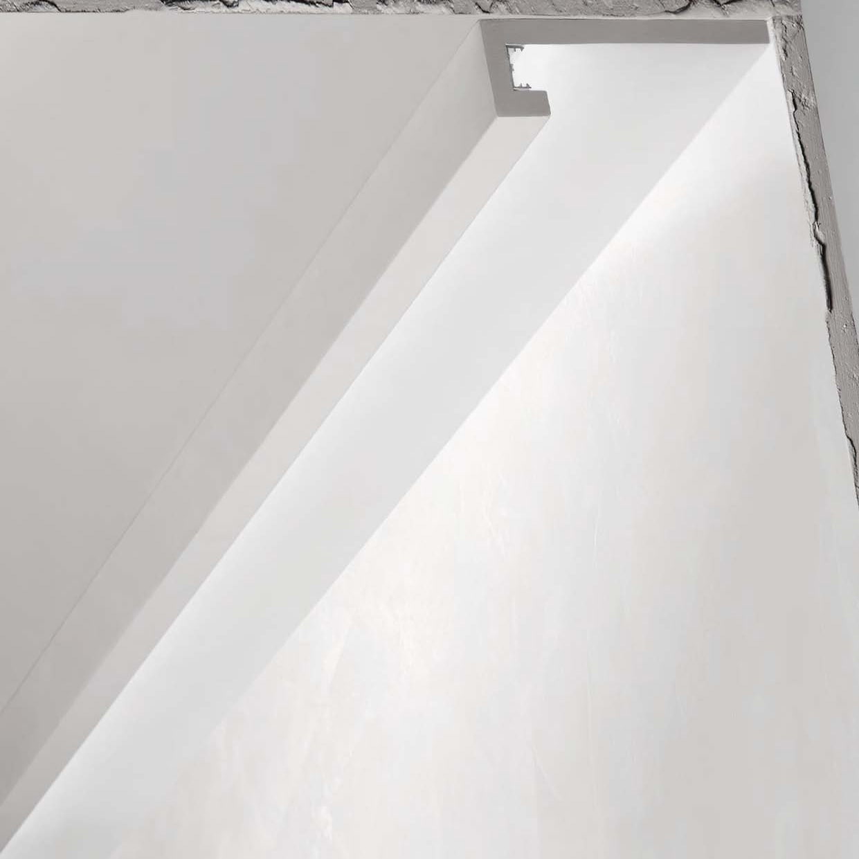 Profilo prefinito in gesso, per installazione a parete, soffitto o come zoccolino, effetto mono-emissione. Elemento completo di una barra in alluminio per applicare una striscia LED.