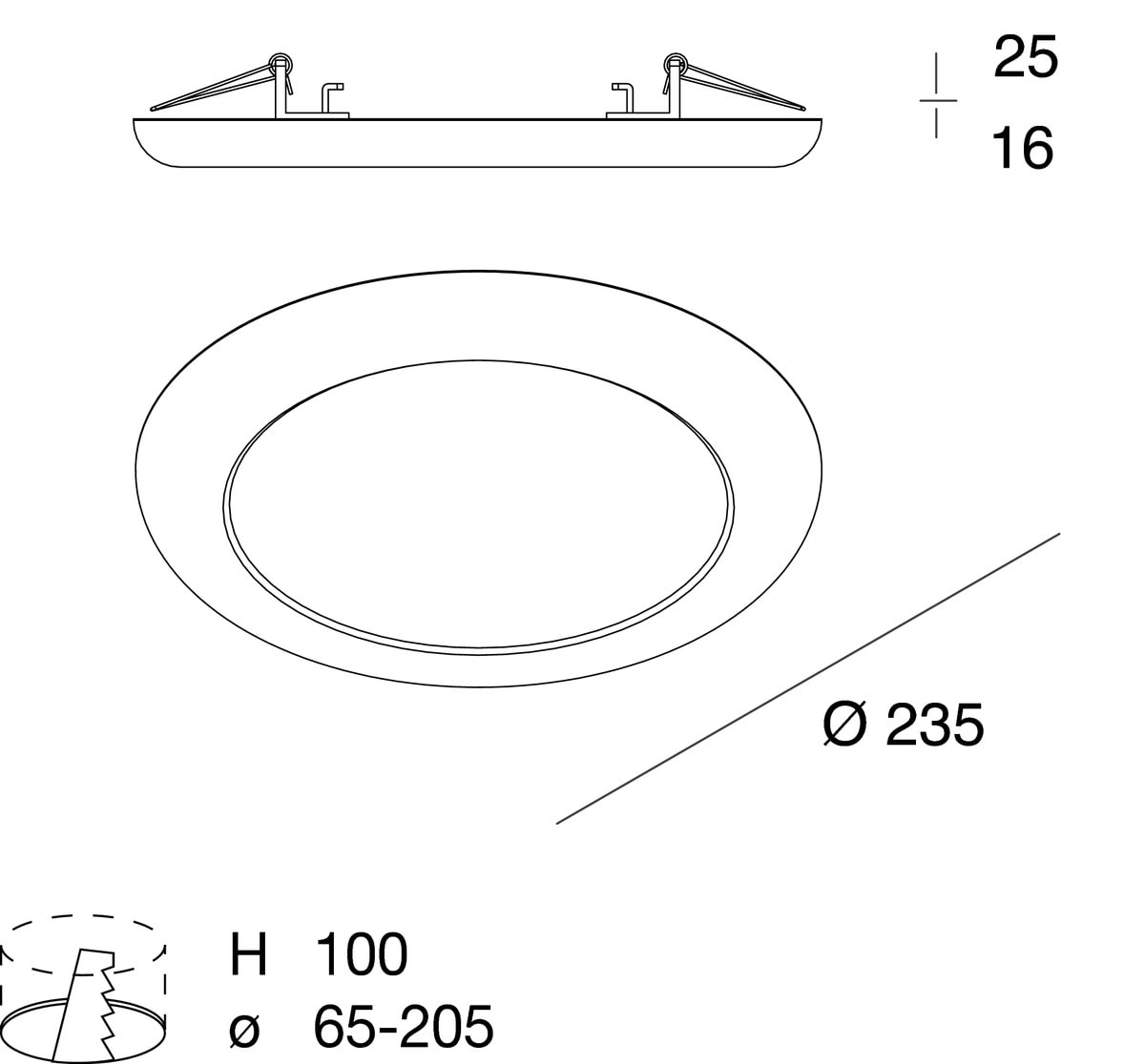 Apparecchio LED per installazione a plafone o ad incasso in battuta in controsoffitto. Temperatura di colore delle sorgenti selezionabile con selettore sul retro dell?apparecchio in 3000K, 4000K o 5400K, potenza totale settabile tra tre disponibili. Corpo in policarbonato e schermo diffusore in polistirene opale. Staffa di installazione in acciaio. Molle in acciaio armonico per fissaggio su controsoffitto di spessore fino a 15 mm, che permettono la regolazione in funzione della dimensione del foro da incasso disponibile. Alimentazione elettronica inclusa, integrata nel corpo dell?apparecchio.