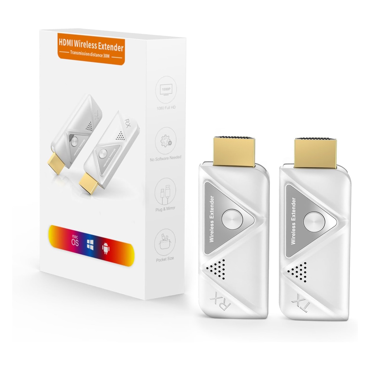 Kit extender wireless HDMI 1080p@60 Hz, conforme HDMI 1.3/HDCP 1.2, banda passante 6,75 Ghz, plug and play - non necessita di configurazione o installazione di software, portata fino a 30mt in spazio aperto, alimentazione da porta USB o alimentatore da 5Vdc - 1A.