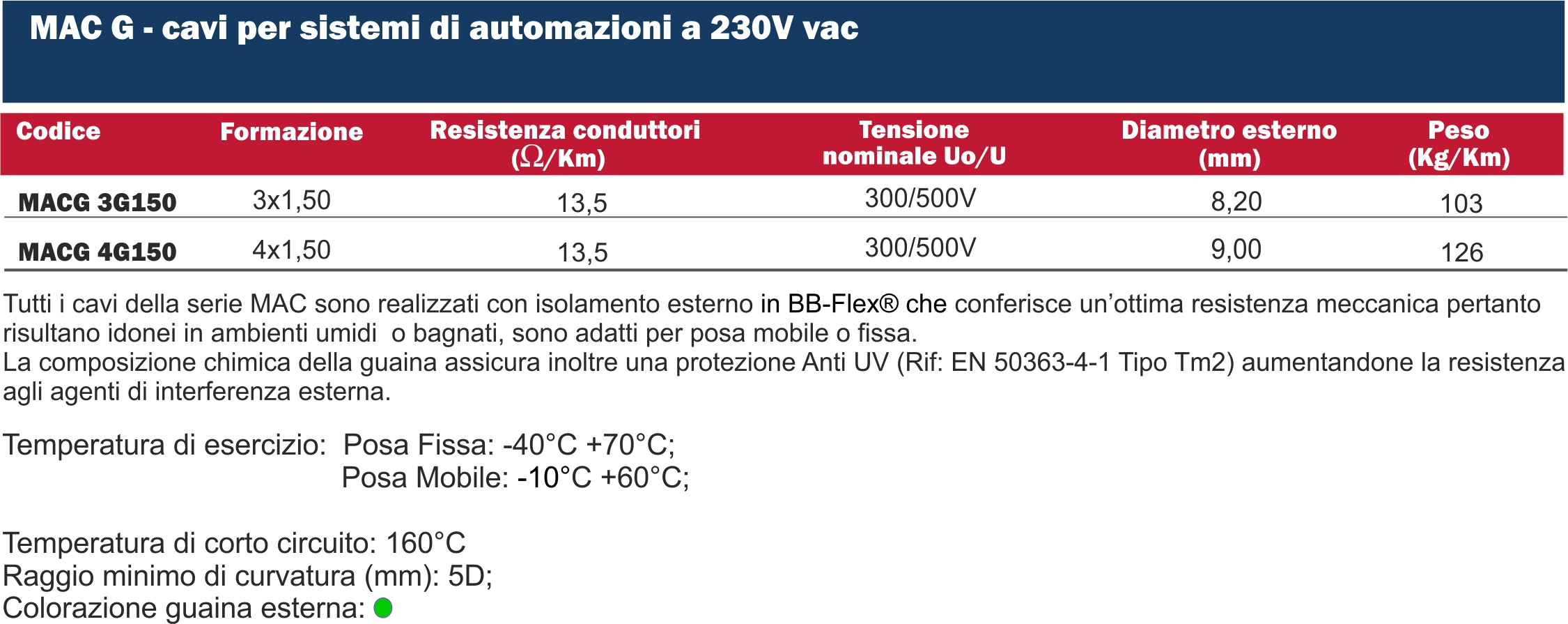 MAC 4G 150 E BB FLEX Cavo per sistemi automazione cancelli e barriere a 230 Vac. Realizzato con conduttori in rame, guaina esterna in BBflex, idoneo alla posa in condizioni critiche in ambienti esterni umidi e bagnati. Filler riempitivo interno garantisce la massima stabilita e prestazioni ottimali in ogni condizione di utilizzo. Euroclasse Eca Formazione: 4x1,50 Imballo: matassa in termoretraibile da 100m