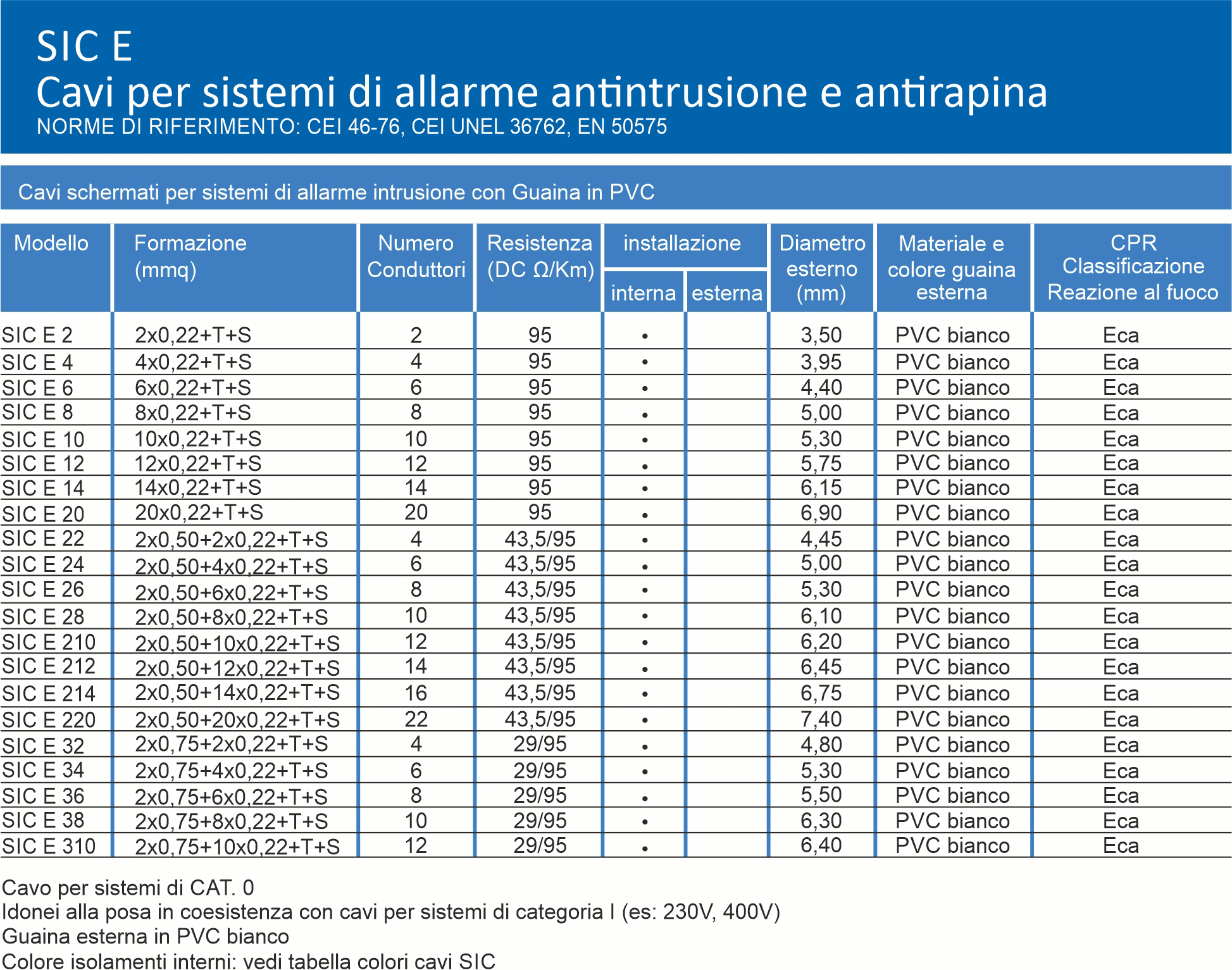 SIC E PVC Cavo per sistemi antintrusione idoneo alla posa in coesistenza con cavi energia 230V 400V . Realizzato con conduttori in rame, guaina in PVC idonea alla posa in interno. Euroclasse Eca Formazioni disponibile: 2x0,75 + 2x0,22 + T + S Imballo: matassa in termoretraibile da 100m
