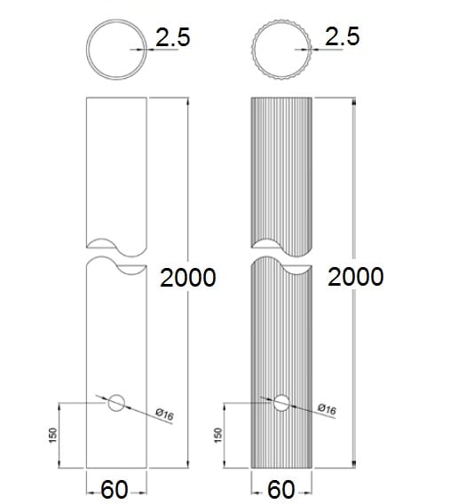 Pali per illuminazione Serie PLV/60-169. Resina poliestere rinforzata con fibra di vetro (Vetroresina) di qualsiasi colore, colori standard Grigio o Nero. La palina per illuminazione, di forma cilindrica è costituita da vetroresina e viene realizzata mediante la tecnica della poltrusione. Le caratteristiche dei materiali utilizzati, la moderna tecnologia di produzione e la sua forma, gli conferiscono infatti elevate prestazioni meccaniche, elevato isolamento elettrico, elevata resistenza alla corrosione ed un ottimo impatto ambientale. Le paline sono a marchio CE, sono disponibili di qualsiasi altezza, colore, rigate. Altezza (H)(mm): 2000. Diametro (D) (mm): 60. Interramento(mm): 440.