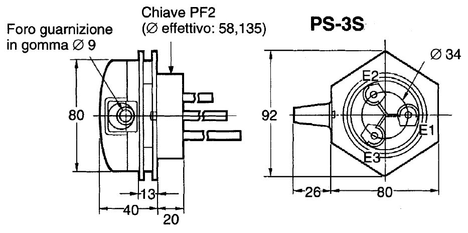 Portaelettrodi PS-3S per regolatori di livello conduttivi predisposto per 3 elettrodi diam. = 6 mm, attacco filettato 2” PF