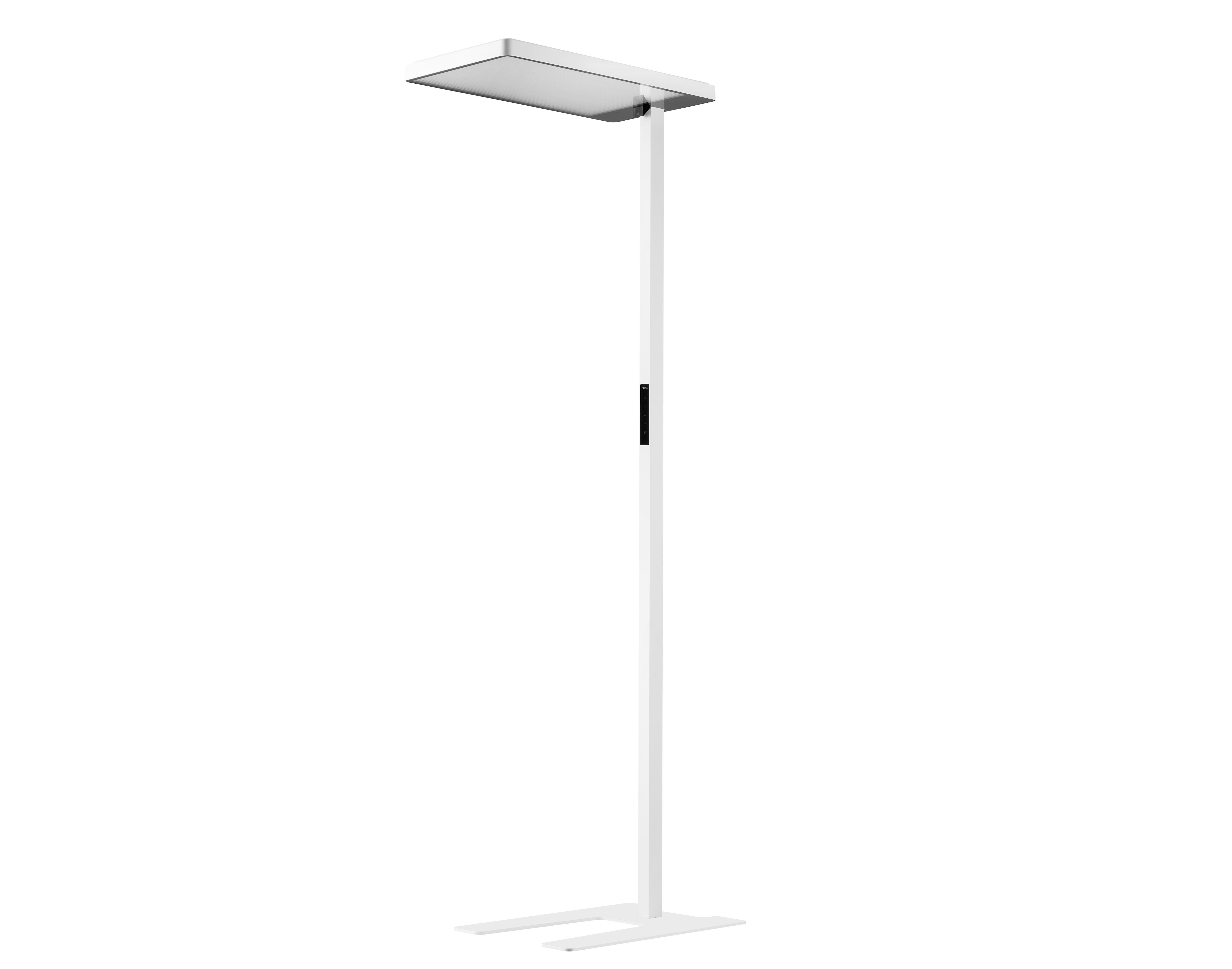 Moderna piantana con emissione diretta/indiretta della luce. Luce estremamente confortevole (UGR < 16). Elegante touch panel. Sensore di movimento e luce diurna integrato. Elevata efficienza di 125 lm/w. Controllo tramite Smart App, possibilita di collegamento a Smart Sensors.