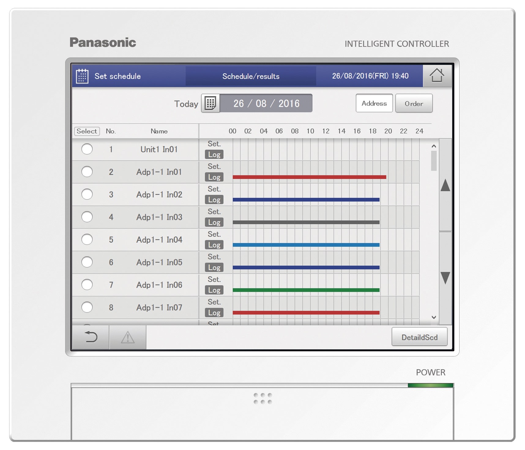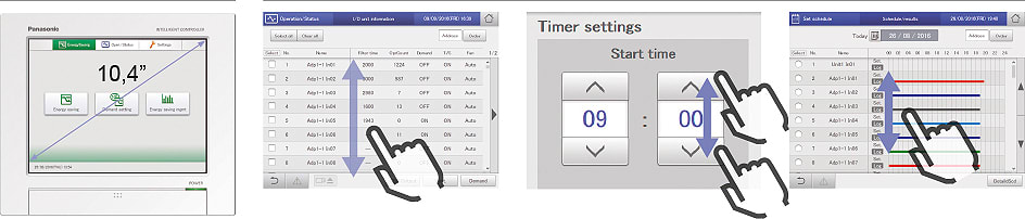 Comando intelligente touch screen CZ-256ESMC3 Ideale per gestire fino a 256 unità interne. Funzionamento intuitivo Le schermate utilizzate per tutte le operazioni seguono un modello comune, con le schermate di facile lettura e di facile utilizzo. Schermo visualizzazione ingrandito (10,4 pollici) con touch screen LDC a colori Utilizzo analogo agli smartphone (passaggio del dito - swipe, scorrimento - flicking)