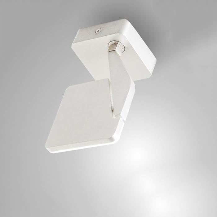 JACKIE - Apparecchio di illuminazione per installazione a soffitto o parete in ambienti interni, con fascio orientabile. Staffa di fissaggio a soffitto/parete in lamiera decapata con verniciatura poliacrilica. Basetta in alluminio pressofuso con verniciatura poliacrilica. Struttura in alluminio estruso con verniciatura poliacrilica in colore bianco opaco. Testa orientabile su due assi, in alluminio pressofuso con verniciatura poliacrilica. Schermo diffusore in materiale acrilico con doppia serigrafia. Elettrificazione ON/OFF integrato incluso. LED 9W 702lm 3000K CRI >80 - 90°.