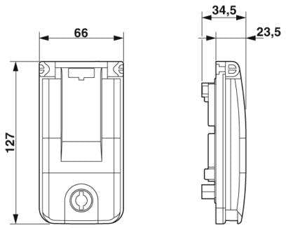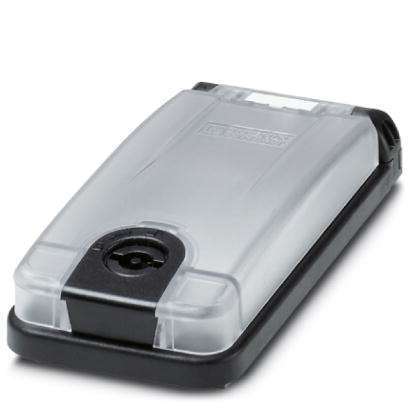 Einbaurahmen für eine Frontplatte/Steckdose, Rahmen: schwarz, Deckel: transparent, Schließung mit 3 mm Doppelbart und beigepacktem Drehknauf.