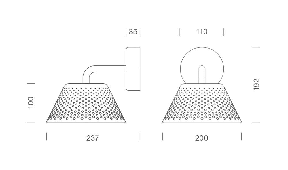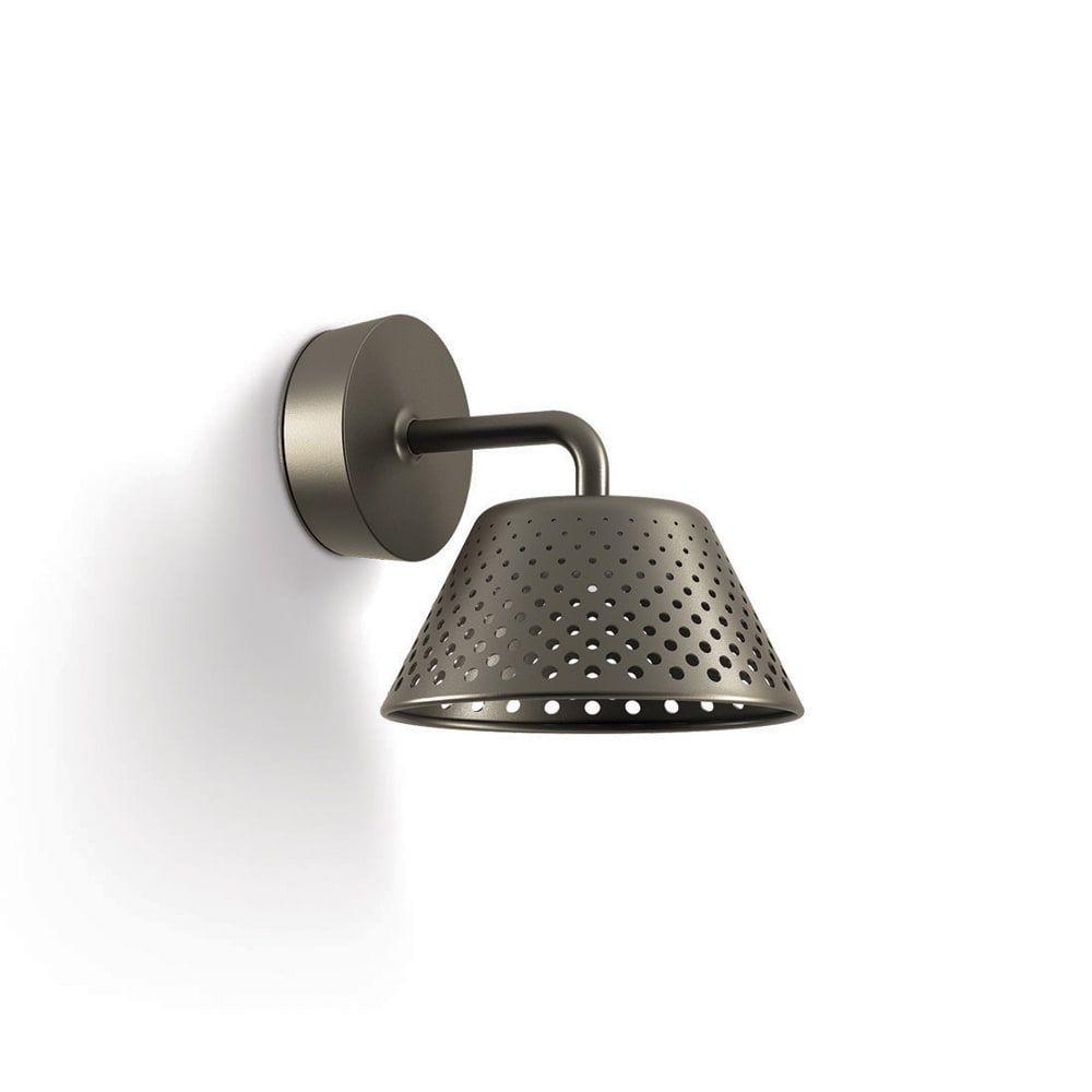 MESH Applique - 3000K - Testa e base realizzate in alluminio verniciato e resistente alla corrosione. Protezione con trattamento di anodizzazione, fondo con polveri epossidiche e verniciatura poliestere. Asta realizzata in acciaio verniciato e resistentealla corrosione. Schermo in policarbonato opale diffondente. Assenza di viti a vista. Alimentatore: 220-240V 50/60Hz. Apertura di fascio: Largo 87°. LED Bianco 10 W 1050 lm 3000K. Finitura bronzo.