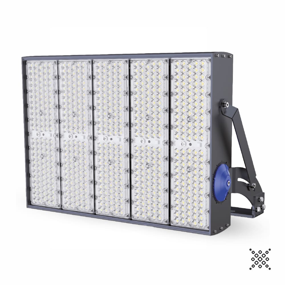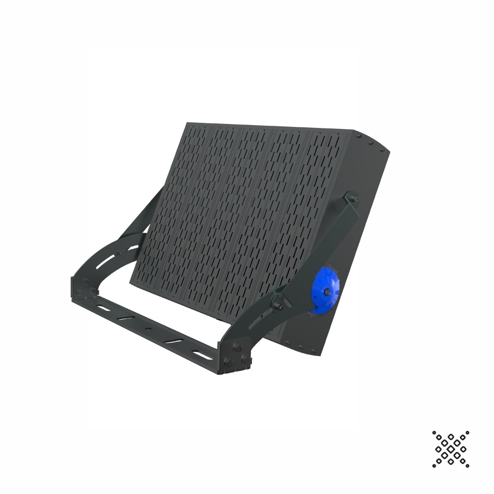 PROIETTORE DA ESTERNO AD ALTE PRESTAZIONI CON SISTEMA OTTICO MULTICHIP PER MIGLIORARE LA DISTRIBUZIONE DELLA LUCE E GARANTIRE UNA ELEVATA EFFICENZA E AFFIDABILITÀ, CORPO CON RESISTENZA AERODINAMICA MIGLIORATA, PASSIVATO E VERNICIATO CON VERNICI EPOSSIDICHE AD ALTA RESISTENZA, BULLONERIA IN ACCIAO INOX E SISTEMA GONIOMETRICO PER UNA PRECISA REGOLAZIONE DEL FASCIO DI LUCE