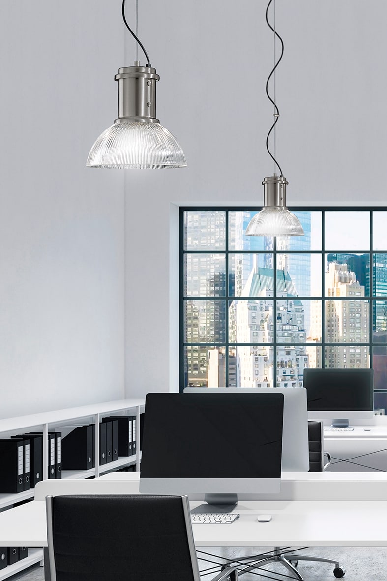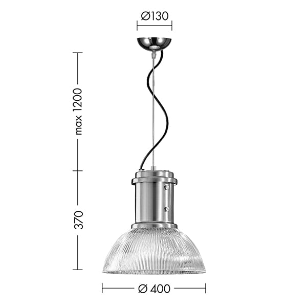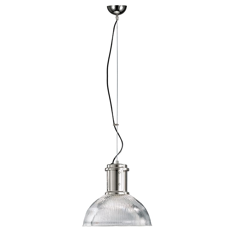 Lampada a sospensione in stile industriale con struttura in metallo nichelato e diffusore in vetro rigato. Attacco E27 che consente di montare lampadi na LED.