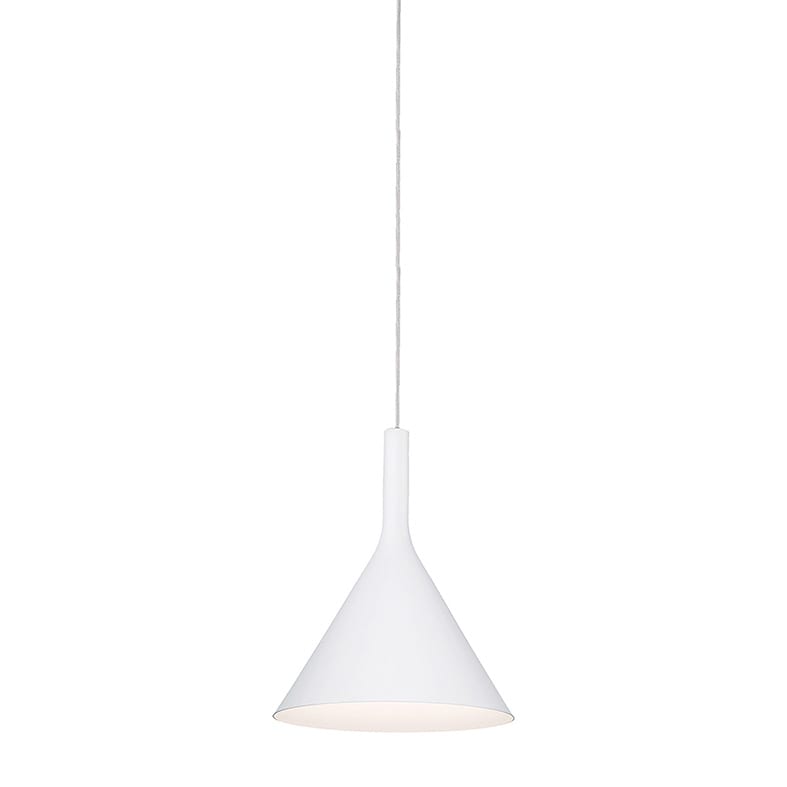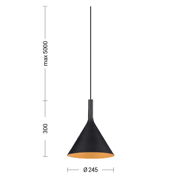 Lampada a sospensione a forma conica in metallo verniciato a polveri, progettata in due differenti misure, in finitura bianca o nera, con interno bianco o oro satinato. Disponibile in versione singola (cavo di sospensione nero o trasparente), con kit decentramento a tre o cinque elementi (cavo in tinta con il corpo lampada) o con possibilit? di decentramento dal punto luce. Soluzione disponibile a nche per binario SQUASH, SQUASH PRO e GROOVE EVO.Attacco E27 che consente di montare lampadina LED.