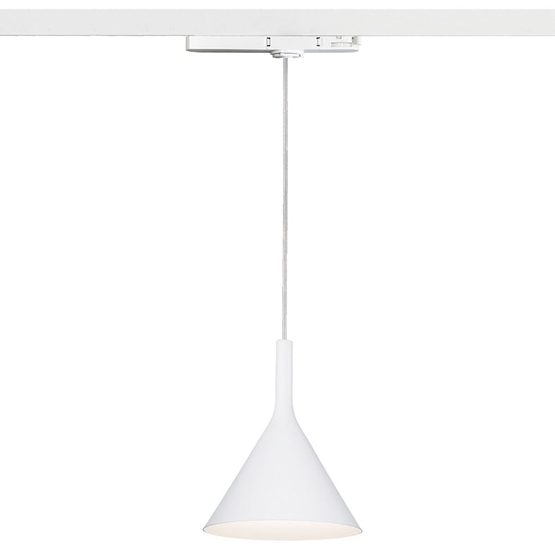 Lampada a sospensione a forma conica in metallo verniciato a polveri, progettata in due differenti misure, in finitura bianca o nera, con interno bianco o oro satinato. Disponibile in versione singola (cavo di sospensione nero o trasparente), con kit decentramento a tre o cinque elementi (cavo in tinta con il corpo lampada) o con possibilit? di decentramento dal punto luce. Soluzione disponibile a nche per binario SQUASH, SQUASH PRO e GROOVE EVO.Attacco E27 che consente di montare lampadina LED.