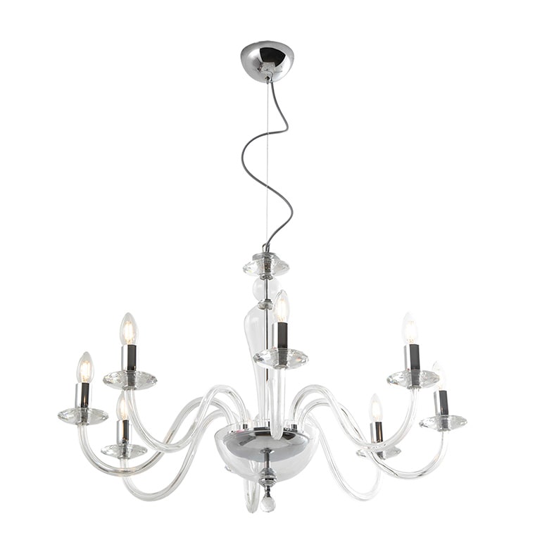 Lampada da parete, a sospensione chandelier e da tavolo con struttura in vetro lavorato a mano in stile classico, dettagli moderni in cristallo ottico e in metallo. La versione da parete è disponibile con due bracci, mentre la versione a sospensione con sei o otto. Disponibili in tre finiture (cristallo, ottanio e rubino). La versione da tavolo è proposta in due finiture (bianco lucido e cristallo trasparente) con paralume in tessuto plissettato di colore bianco. Attacco E14 che consente di montare lamadina a LED.