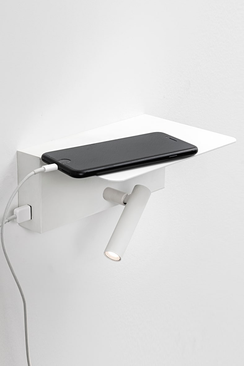 Lampada da lettura orientabile a LED (3000K), proposta nella versione a parete, da tavolo con base da appoggio o con comoda pinza che permette di posizionare la lampada su mensole, ripiani o scaffali. La versione a parete ? proposta con attacco circolaresu cui ? posta l?accensione, o con corpo lampada orientabile e supporto rettangolare con attacco USB che consente la ricarica dei propri dispositivi digitali. Il braccio flessibile ? rivestito da una guaina restringente nera per le varianti colore, bianca per la versione bianca, orientabile e modellabile a piacimento. Fascio di luce concentrato che rende il prodotto adatto ad installazioni in camera da letto o nelle camere d?albergo. Disponibile in cinque finiture (bianco, nero, rosso, gial lo e oro satinato).