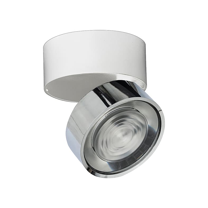 Proiettore LED di forma tonda con alimentatore integrato per illuminazione puntuale. Applicabile a parete, a soffitto, a sospensione e a binario (installabile su binario trifase GROOVE evo e YAKI evo). Disponibile con base nera o bianca, con anello in sei finiture (bianco, nero, cromo, oro, bronzo, rame). Orientabile su due assi di 355° rispetto all'asse verticale e di ±90°rispetto all'asse orizzontale. Proposto con ottica di 38° e disponibile ottica da 12° da ordinare separatamente come accessorio. Struttura in pressofusione di alluminio verniciato con polveri. In virtù dell'ottima resa cromatica (CRI>90) e della versatilità di utilizzo, il prodotto è adatto per ambienti retail, residenziali e spazi museali.